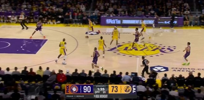 在湖人以73-90落后的时候,球队中的5个人退而不防,邓恩轻松笑纳快攻空篮。湖人在第三节被对手打出一波流之后,就再也无法还击,最终输球。